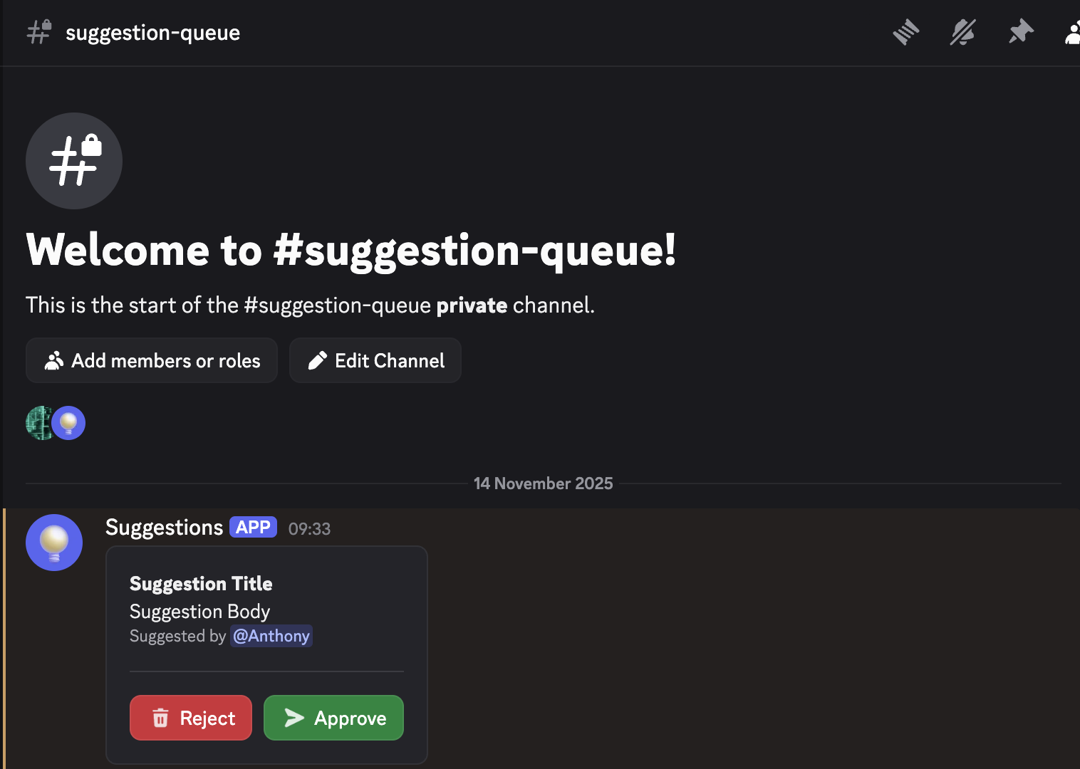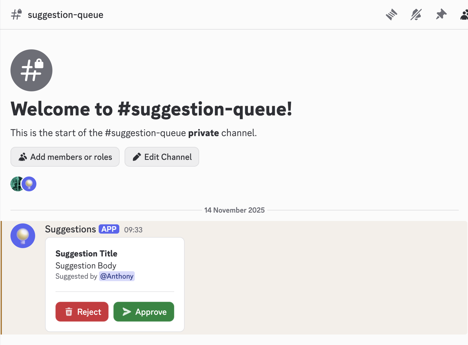 Queued suggestions are sent to this channel and you can approve or reject suggestions.